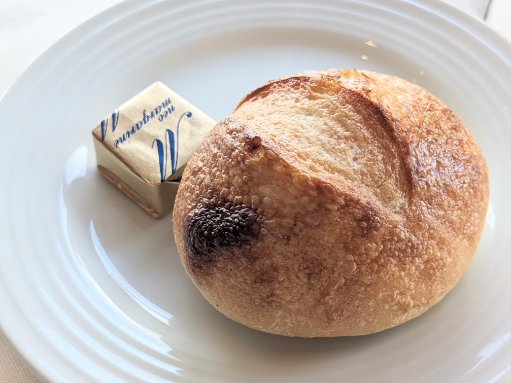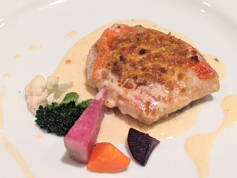魚のメインディッシュは金目鯛のウニバターソースです。ウニをふんだんに使ったソースは贅沢で濃厚な味わいです。写真の魚の下にたっぷりと敷かれています
