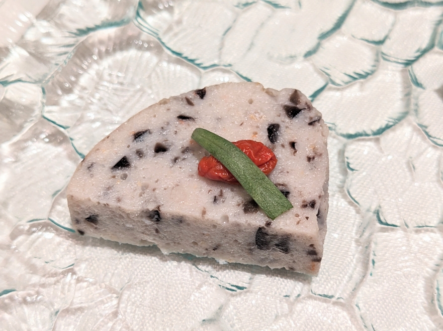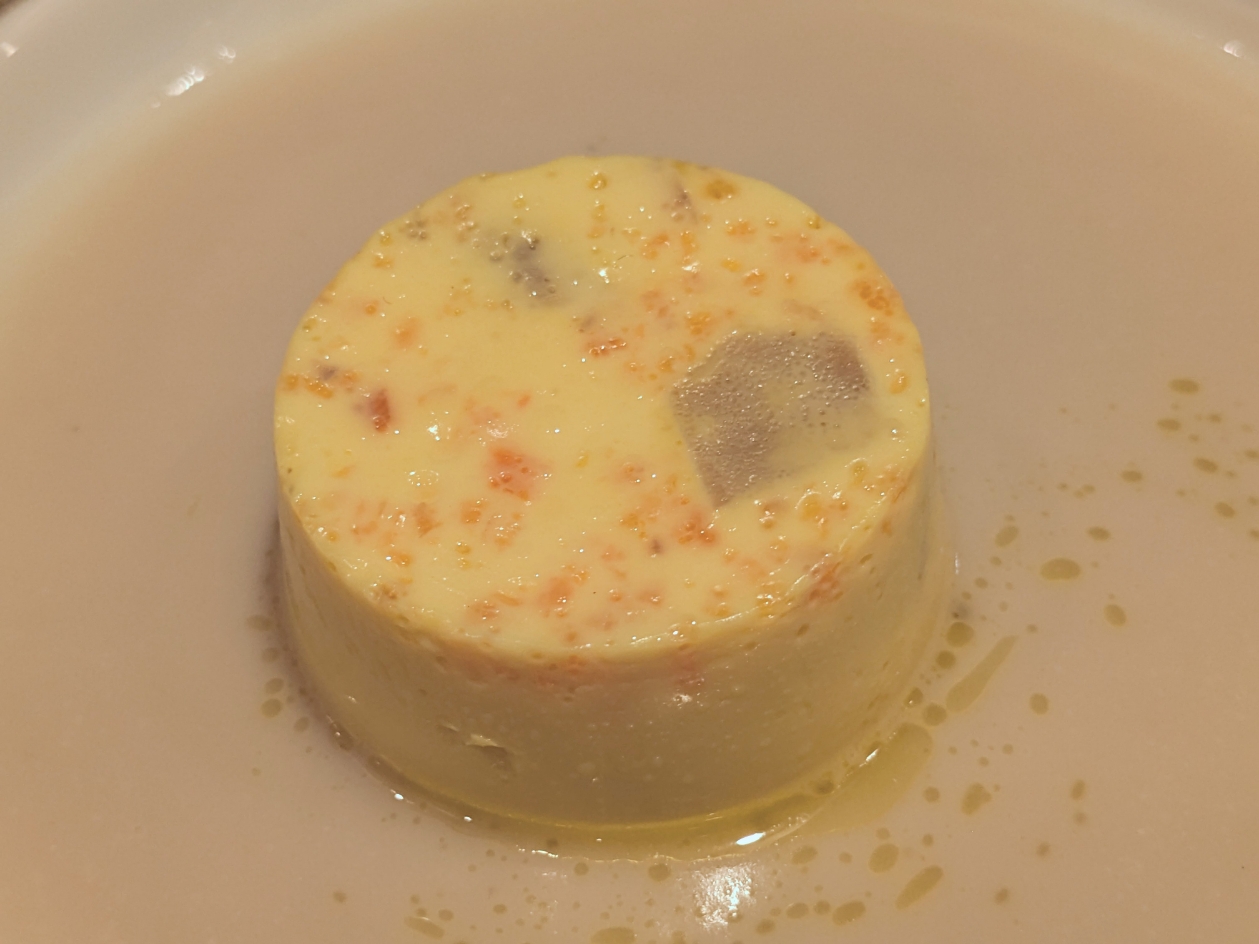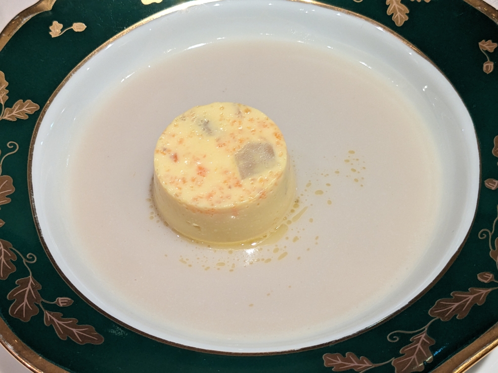 スープの中央には玉子で作られた洋風茶碗蒸しが乗っています。中にクワイの実が入っていてシャキシャキとした独特の食感が楽しめます。