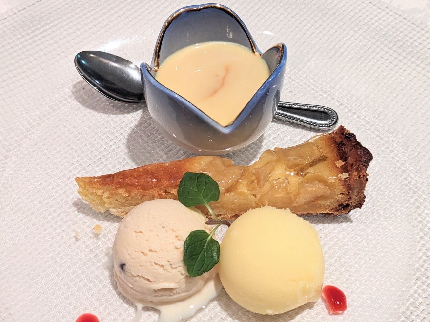 デザートです。 アイスと柚子のシャーベット、アップルパイ、パンナコッタです。