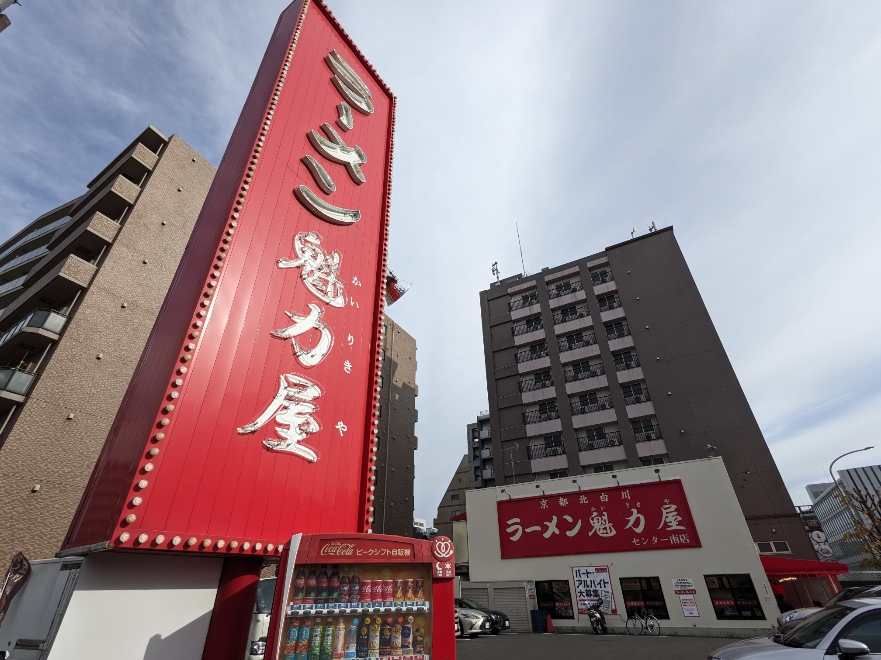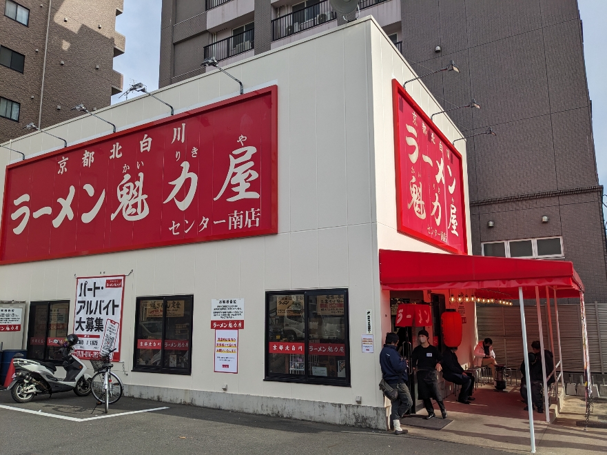 魁力屋は鶏ガラスープに背脂を浮かせた京都ラーメンの代表格です。 お店は交差点を挟んで都筑郵便局の反対側にあります。