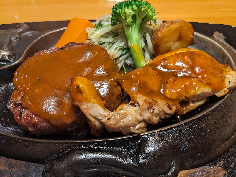120gのハンバーグとチキンソテーのセット。 ソースはデミグラスソースにしました。
