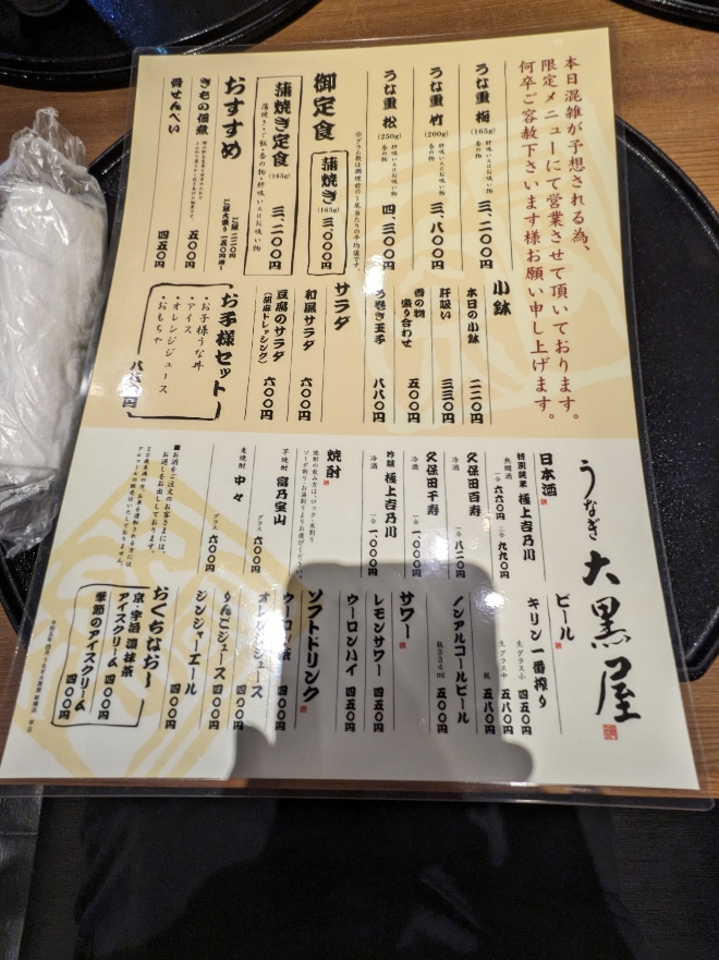 混雑が予想され日の限定メニューです。 白焼きなど、時間のかかるものは外されています。 値段は昨今の鰻の高騰振りからすると、リーズナブルな設定かも。