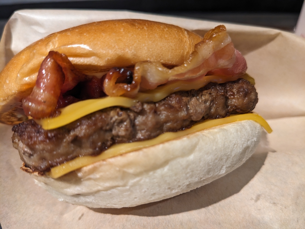シングルでもボリューム感のあるハンバーガーです。 某有名ハンバーガーチェーンの薄くて小さいベーコンと違って、ベーコンの味がしっかりと楽しめます。