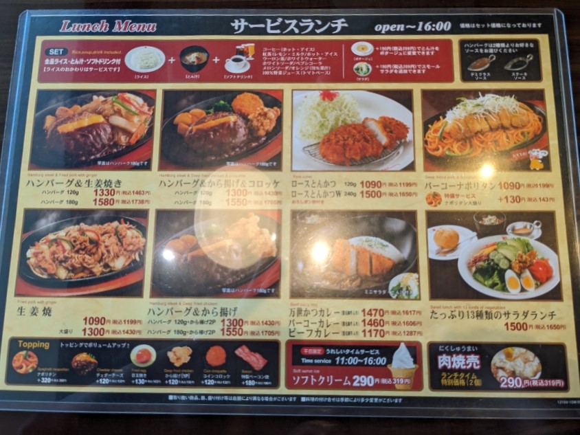 サービスランチ ●ハンバーグ&生姜焼き ●ハンバーグ&から揚げ&コロッケ ●ロースとんかつ ●パーコーナポリタン ●生姜焼き ●ハンバーグ&から揚げ ●万世かつカレー ●たっぷり13種類のサラダランチ