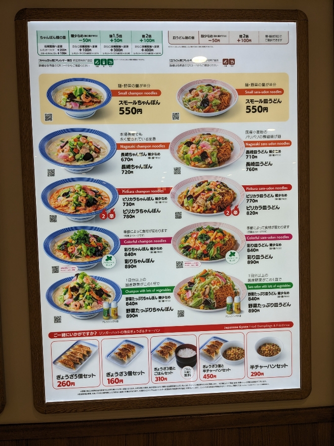 店頭のメニュー ●スモールちゃんぽん ¥550 ●長崎ちゃんぽん ¥720 ●ピリカラちゃんぽん ¥780 ●彩りちゃんぽん ¥890 ●野菜たっぷりちゃんぽん ¥890