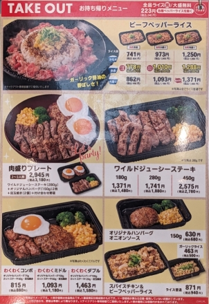 お持ち帰りメニュー ●ビーフペッパーライス 900〜1,480円 ●肉盛りプレート 2〜3人前 3,180円 ●ワイルドジューシーステーキ 1,480〜2,780円 ●わくわくコンボ〜ダブル 880〜1,580円 ●オリジナルハンバーグ 680円 ●スパイスチキン&ビーフペッパーライス 940円 ●ガーリックライス 500円