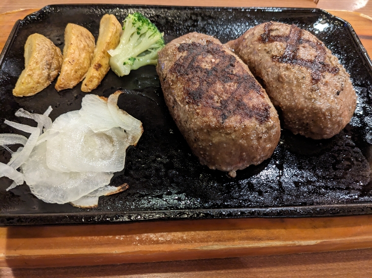 直火焼、粗びきビーフ100%のハンバーグステーキ。210gの大き目のハンバーグが半分に切って提供されます。