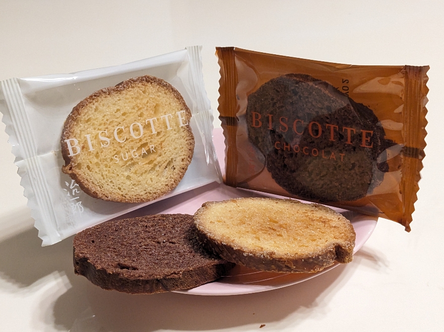 バウムクーヘンで有名な治一郎ですが、他にもお菓子があります。ビスコットもその一つ。ラスクですね。シンプルなシュガー味と、チョコレート味のショコラの2種類があります。