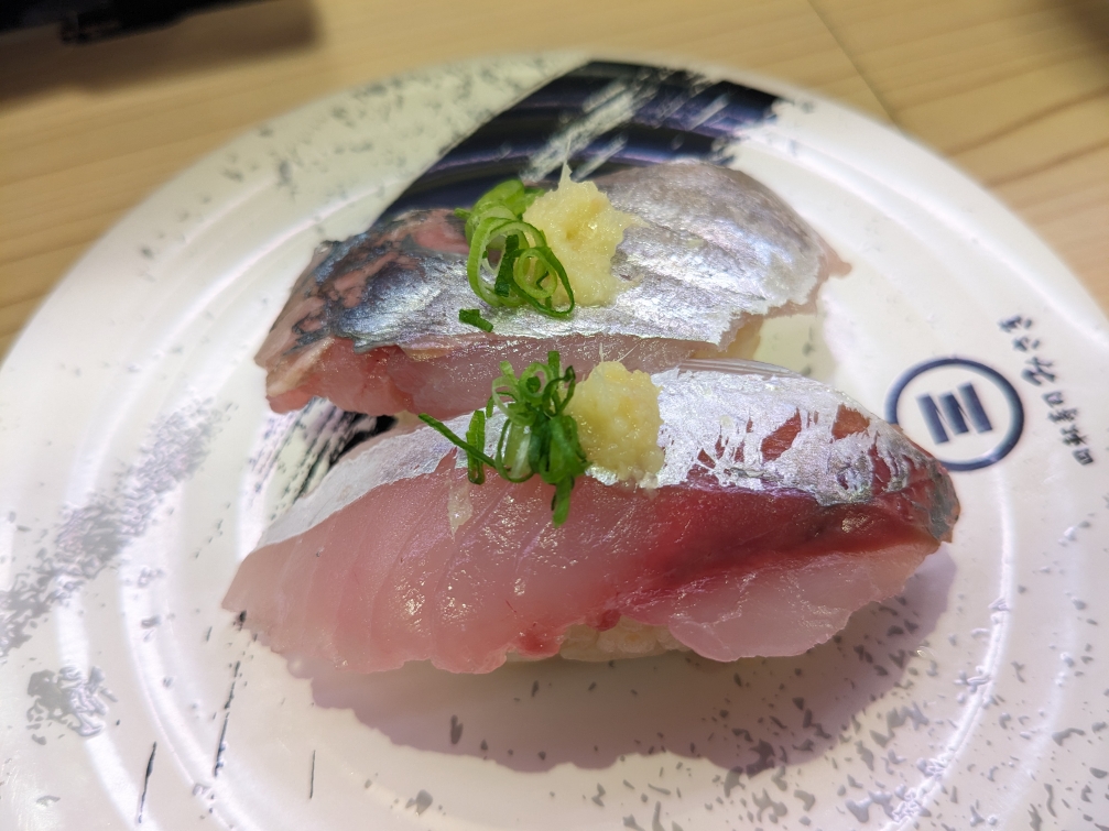 「こはだ」です。シャリとネタの間に、大葉とガリが入っているのが斬新。2貫1皿¥170