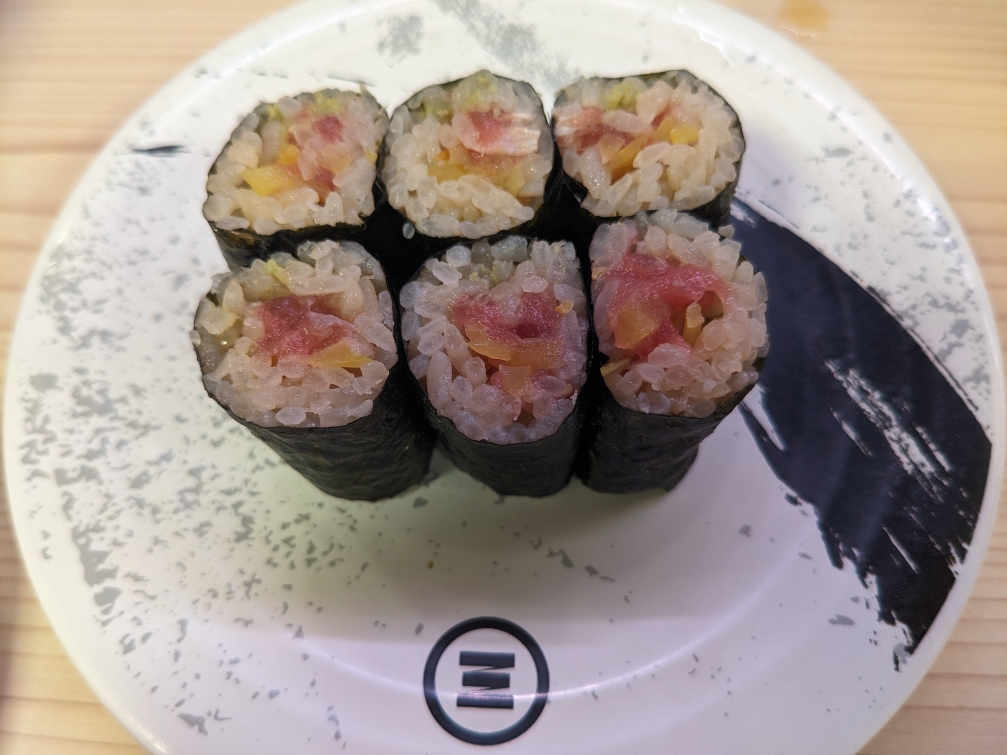 「天然インドまぐろとろたく巻き」です。トロと沢庵のコンビがこんなに美味しいとは。 ¥350。