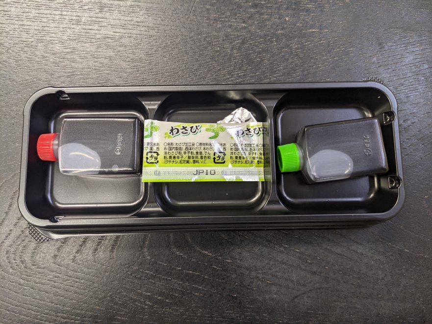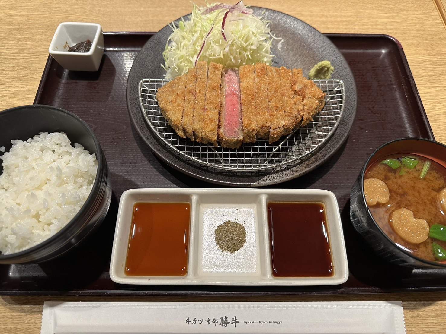 牛カツソース、だし醤油、山椒塩、ワサビが添えてあります。個人的にはだし醤油+ワサビがあっさりとしていて、牛カツには一番合うと思います。