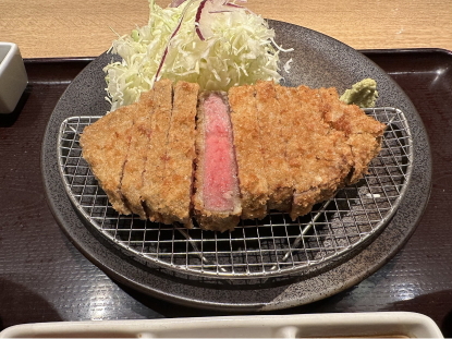 衣は薄めにサクッと揚がっています。厚みのある牛カツは丁度いい具合にレアで揚がっています。とんかつと違ってあっさりと食べられます。