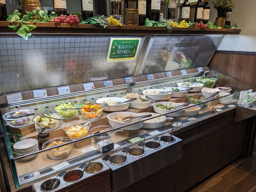店内のサラダバーです。 数多くのサラダ・フルーツが並びます。ドレッシングも豊富です。