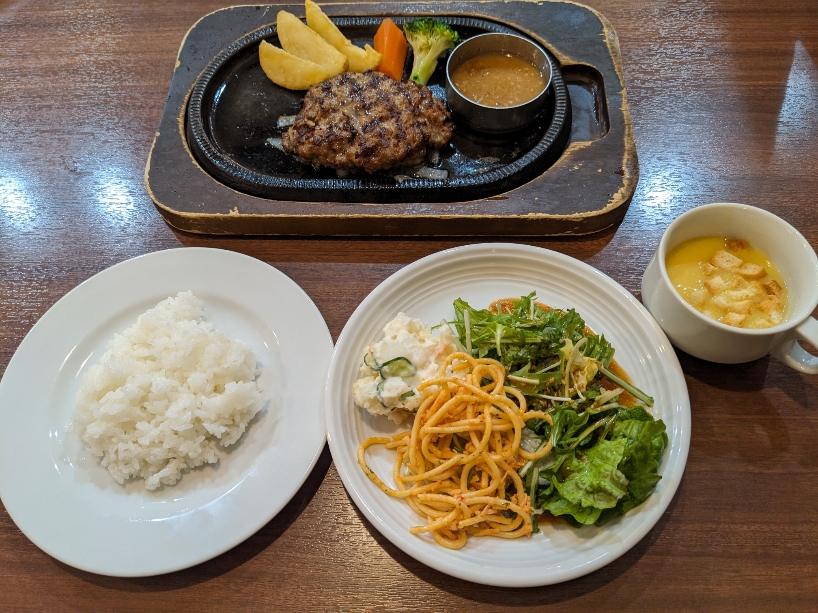 サラダバー、スープバーが付いたハンバーグのセットです。