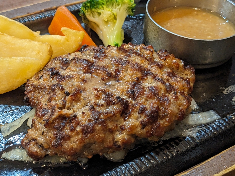 230gのハンバーグです。焼き加減も良くて香ばしく、確かに謳い文句通りに美味しい。さすが肉の専門店と思わせます。ソースは7種類から選べます。今回選んだのは「にんにく醤油」です。