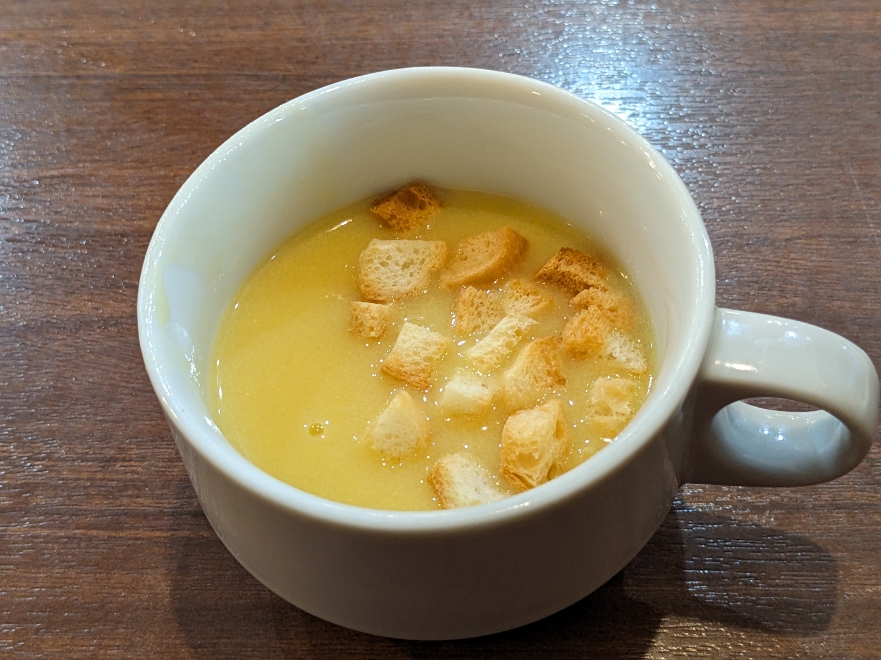 スープです。スープバーから選べます。ポタージュスープを選びました。クルトンも付いていて美味しいです。