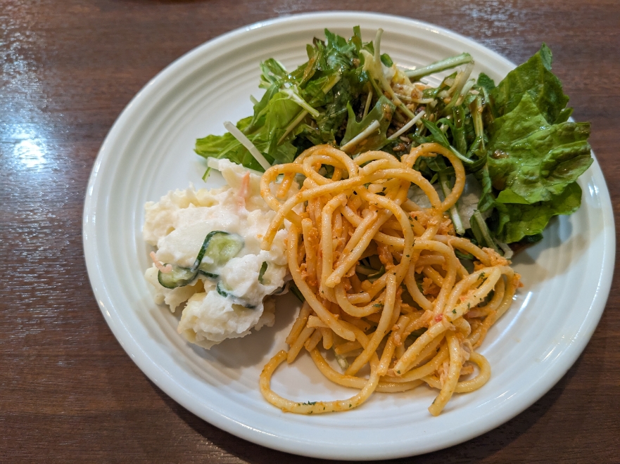 サラダです。たくさんの種類があるサラダバーから自分の好みで選べます。ドレッシングも数種類から選べます。フルーツやデザートもありました。