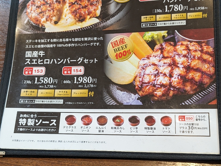 7種類の特製ソース ・デミグラスソース ・オニオンソース ・にんにく醤油 ・和風おろしソース ・ピリ辛ソース ・特製醤油ソース ・トマトソース