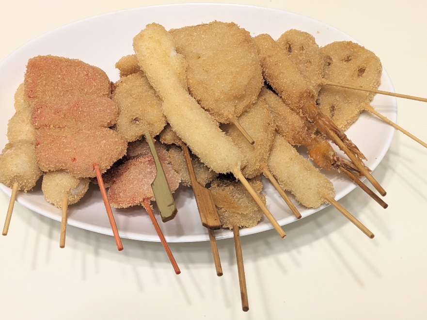 串カツ牛、串カツ豚、玉ネギ、レンコン、エビ、うずら、紅しょうが、チーズの6種類が各2本ずつの16本です。