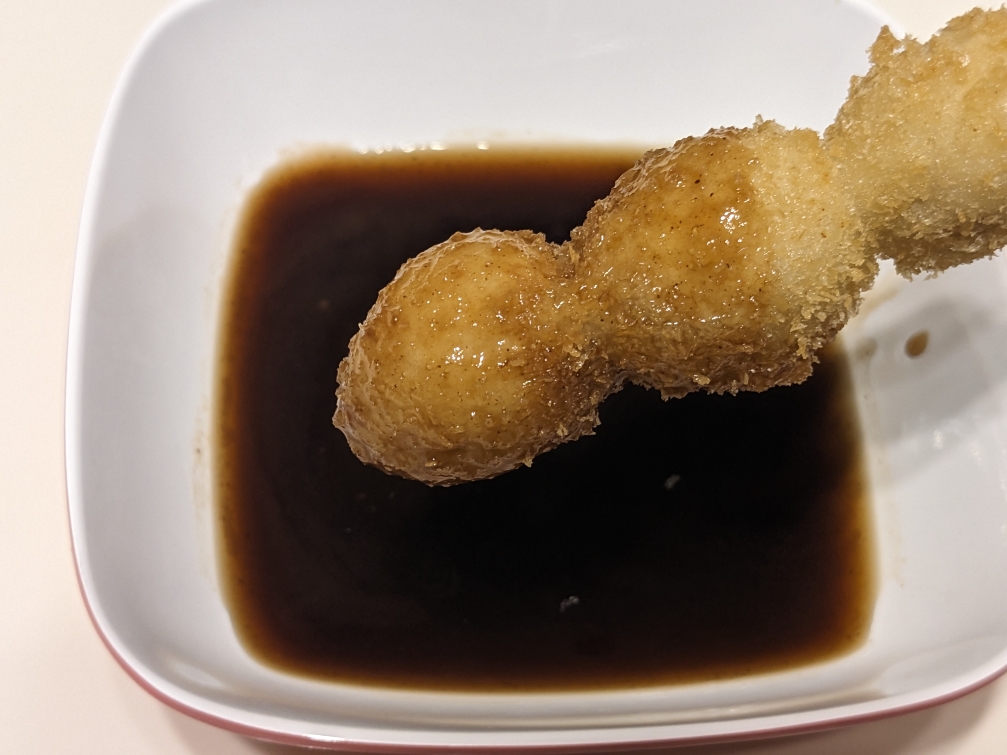 サクサクの串カツが入っています。これに添え付けの特製ソースをかけます。ソースはいかにも大阪といったウスター風の甘めのソースです。