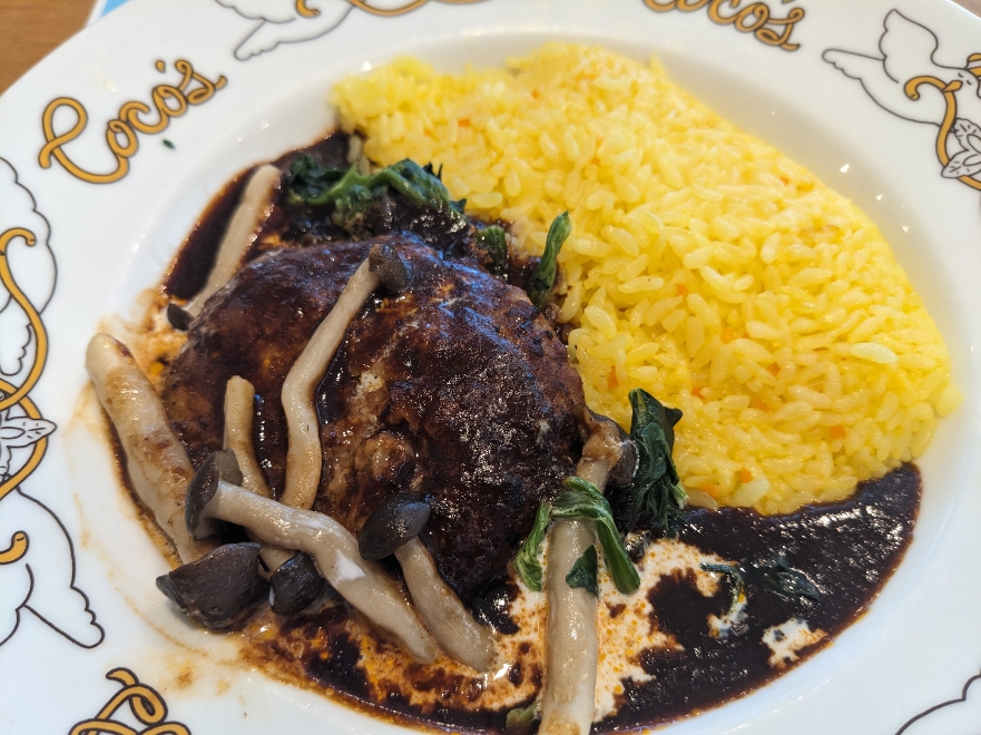 ターメリックライスに乗ったハンバーグに濃厚なきのこのデミグラスソースがかかっていて、一口目から美味しいと感激です。