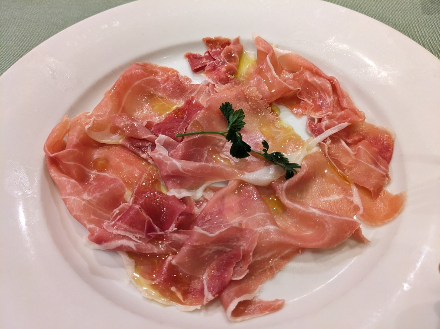 スペイン産生ハムの「ハモン・セラーノ」。 適度な塩加減が美味しい生ハムでした。サラダと一緒に食べるとより美味しかったです。