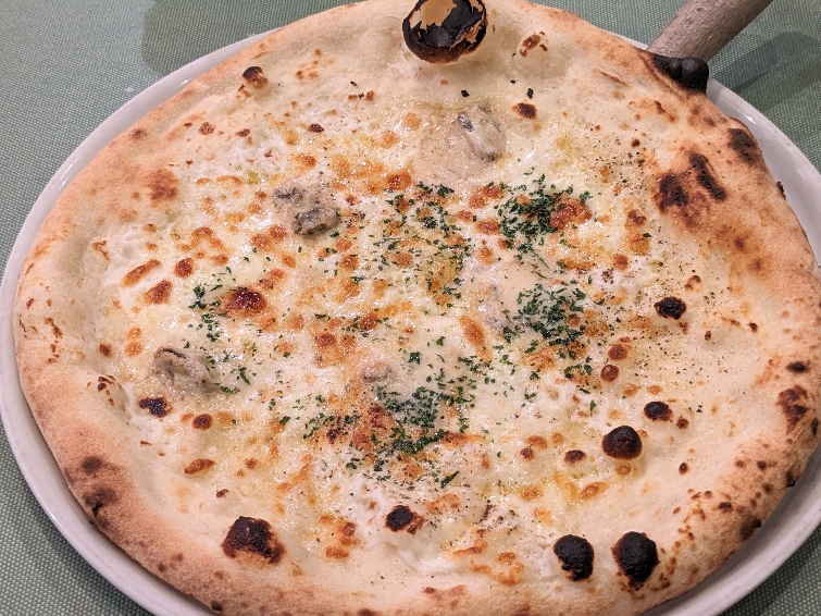 「フォルマッジョ」です。4種類のチーズで作られたピッツァです。蜂蜜をかけて頂きます。チーズの塩味と、蜂蜜の甘味が不思議とよく合います。