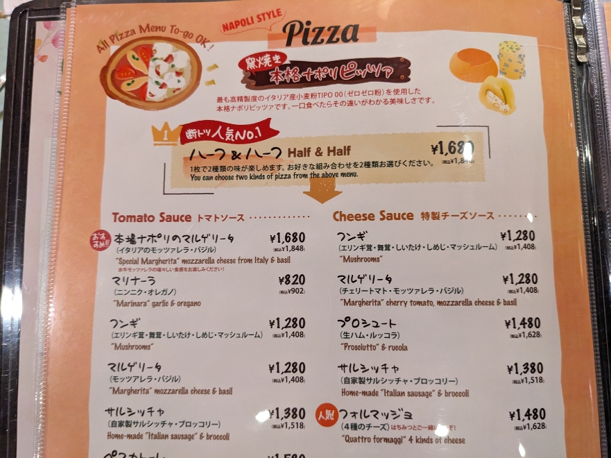 ピッツァのメニューです。 本場ナポリのマルゲリータ ¥1,848 フォルマッジョ ¥1,628