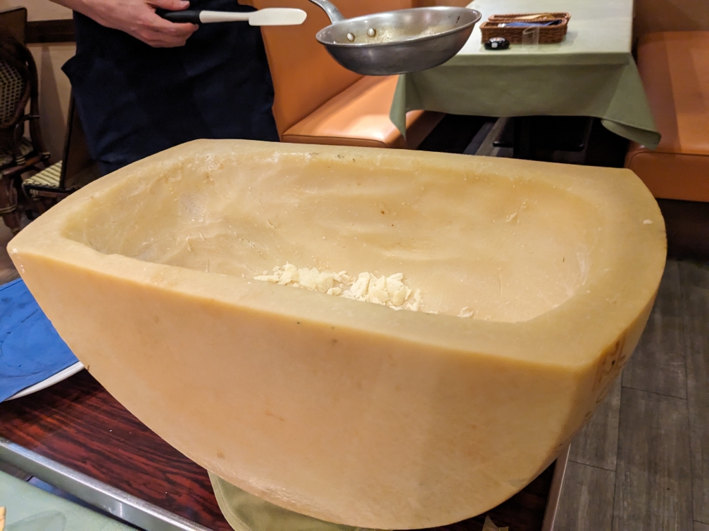 ポルチーニリゾットを完成させる際に入れる器はなんとチーズで出来ています。このチーズを削って完成させます。