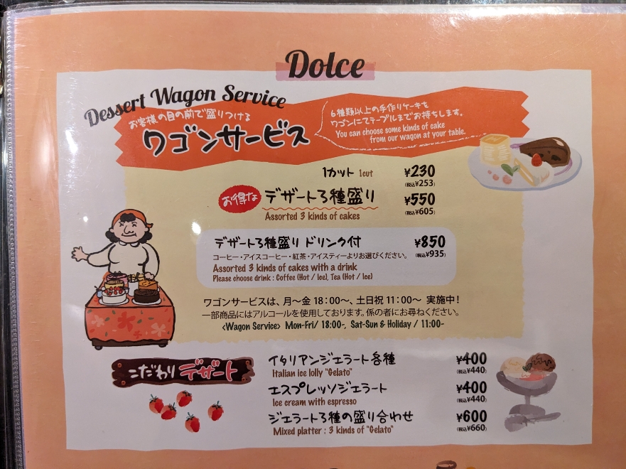 デザートワゴンサービスのメニューです。 デザートワゴン1cut ¥253