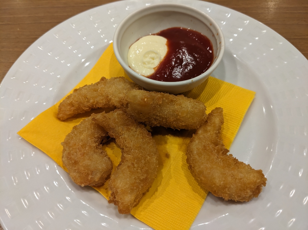 「ポップコーンシュリンプ」です。大きめのエビをオーロラソースで。