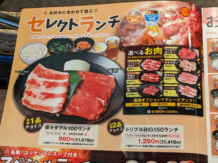 メニューです。カルビが80gのセットは1,419円。今回は120gをチョイスしたので、1,859円です。