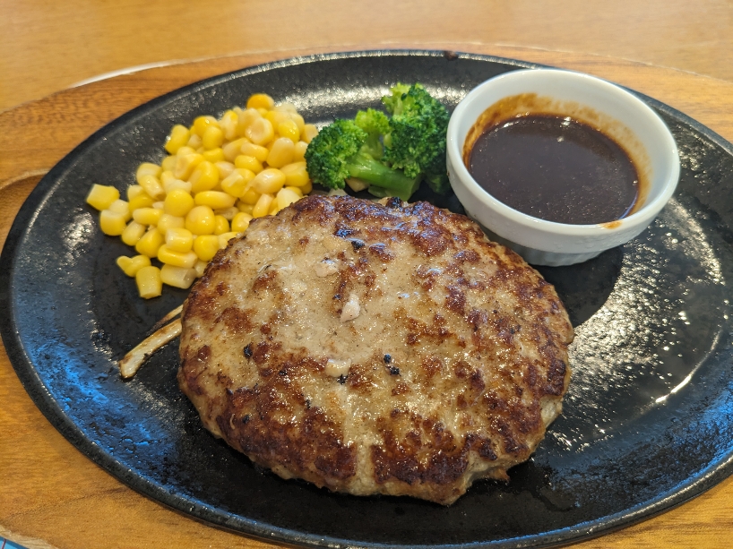 ハンバーグはペレットで加熱して頂きます。ソースは3種類が選べますが、ガーリックステーキソースがオススメ。