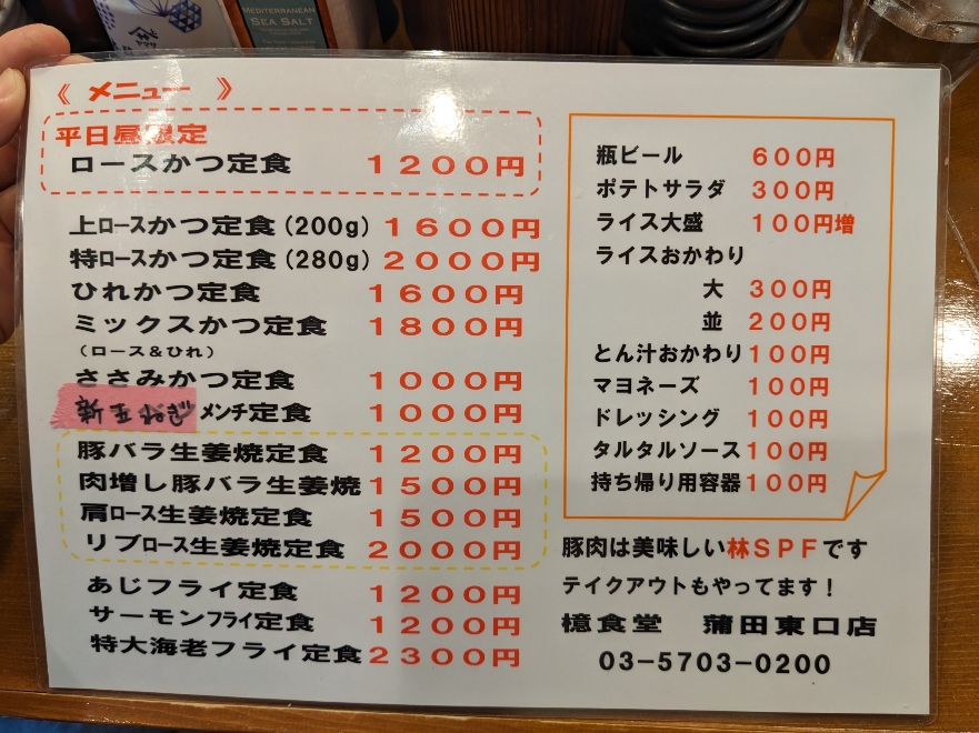 平日昼限定 ロースかつ定食 1200円 上ロースかつ定食(200g) 1600円 特ロースかつ定食(280g) 2000円 ひれかつ定食 1600円 ミックスかつ定食 (ロース&ひれ) 1800円 ささみかつ定食 1000円 新玉ねぎメンチ定食 1000円 豚バラ生姜焼定食 1200円 肉増し豚バラ生姜焼 1500円 肩ロース生姜焼定食 1500円 リブロース生姜焼定食 2000円 あじフライ定食 1200円 サーモンフライ定食 1200円 特大海老フライ定食 2300円