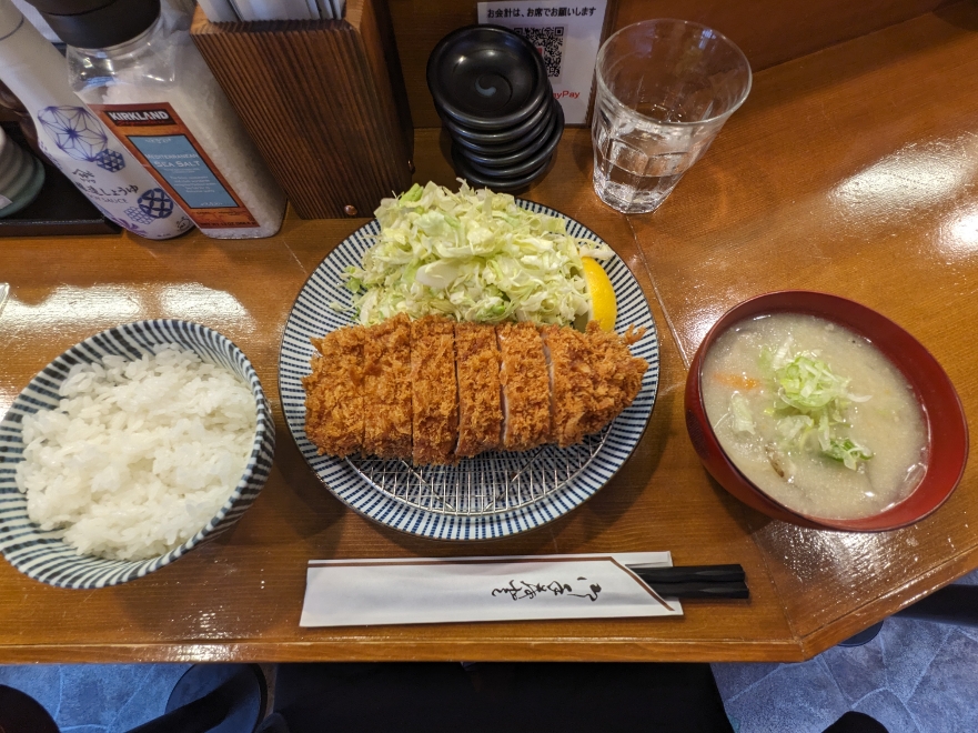 平日のお昼限定の「ロースかつ定食」。大きめのロースカツと豚汁とご飯のセットです。ご飯は白米と麦ごはんが選べます。お水にもほのかにレモンがするなど、細かい心配りがあります。