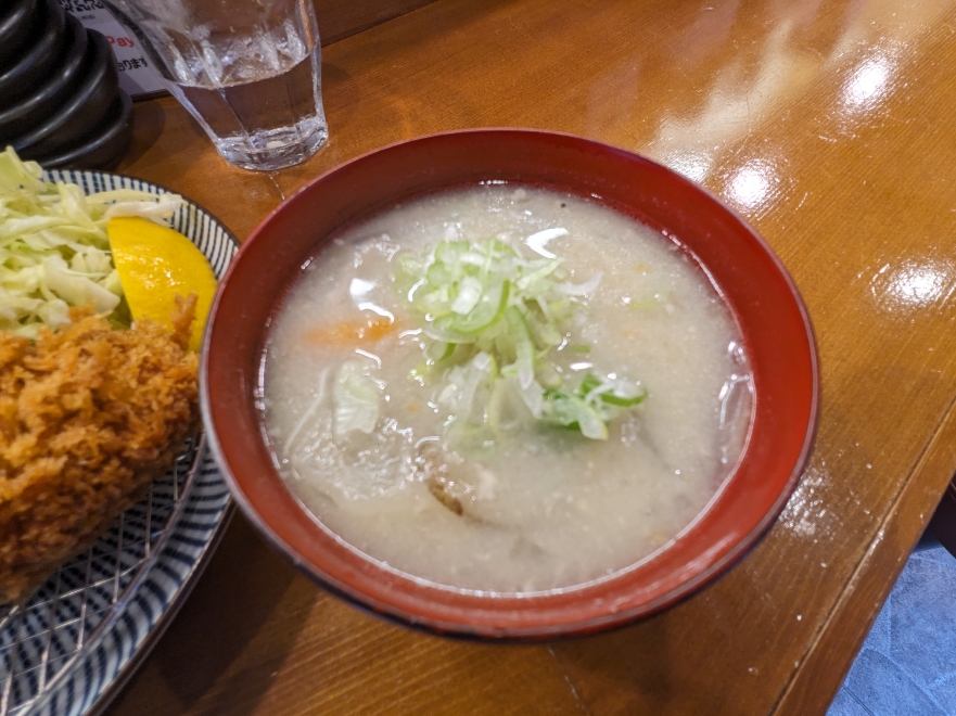 豚汁は麦味噌を使っていて、普通の豚汁とは少し趣きが違います。クリーミーな味わいでシチューに近いと言えば、分かりやすいと思います。具もたくさん入っていました。