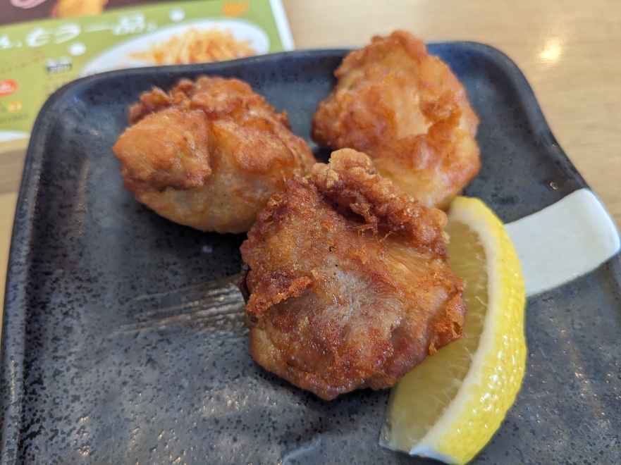 唐揚げが4つ付いてきます。結構濃いめの味付けです。ご飯は進みますが、少ししょっぱく感じました。
