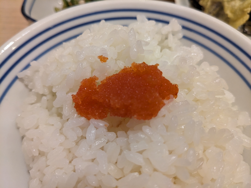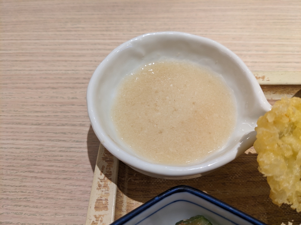 てんぷらです。中身はナス、エビ、白身の魚、あなご、カボチャ、イカです。イカが肉厚で美味しかったです。