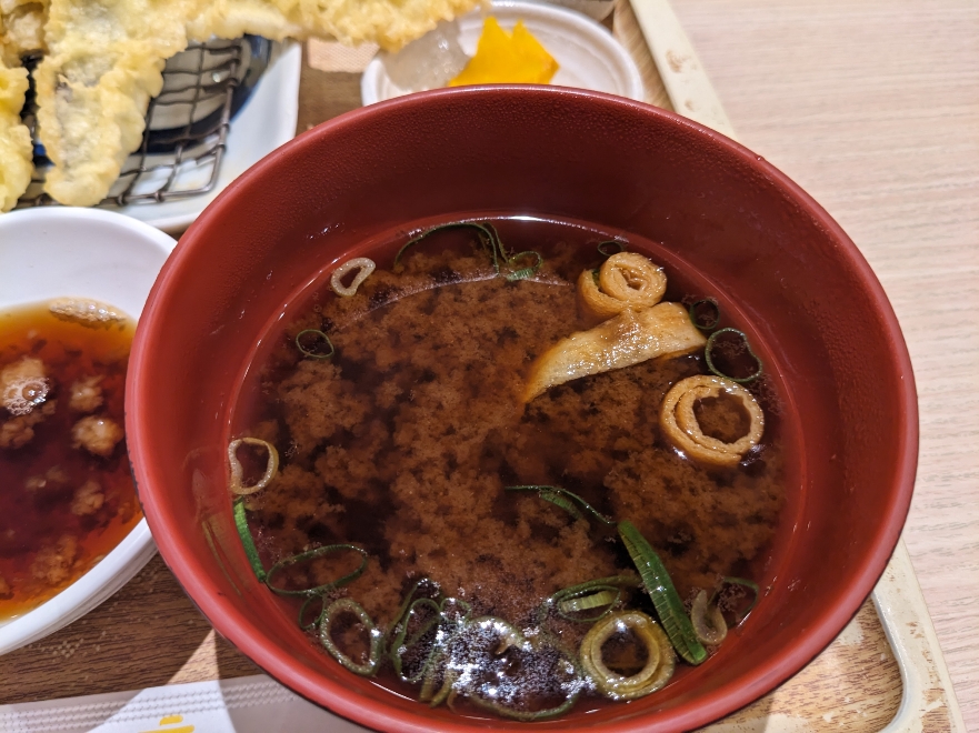 大きなアナゴを含んだ天ぷら、赤だしのお椀、とろろ、香の物、デザートがセットになっています。¥1,550
