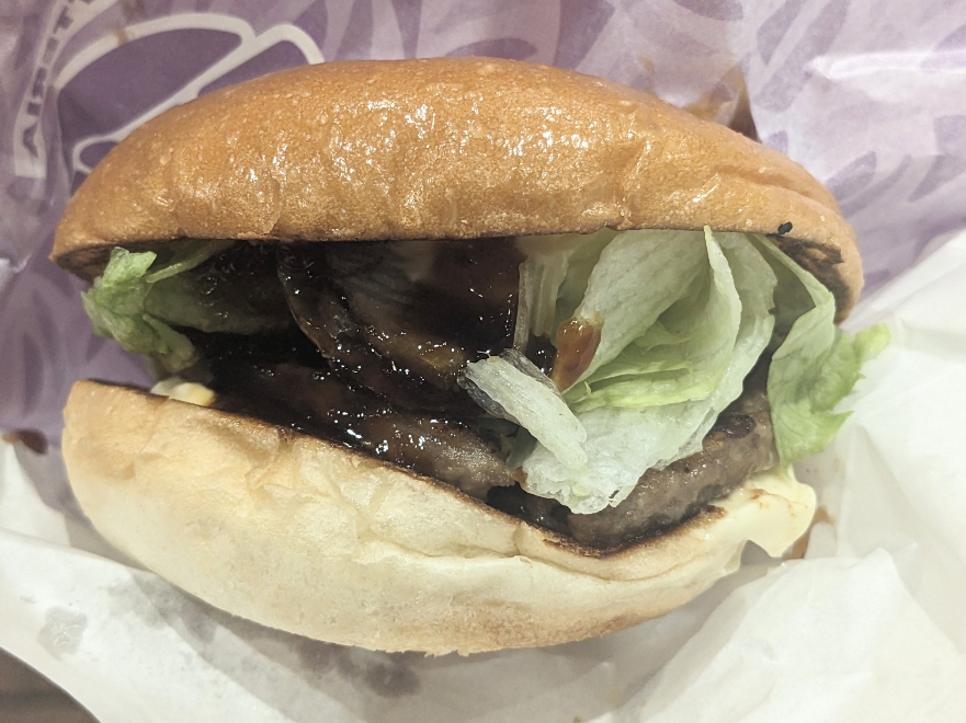 「てりやきビーフバーガー」です。醤油ベースのてりやきソースで味付けされています。少し味が濃くてしょっぱい印象でした。