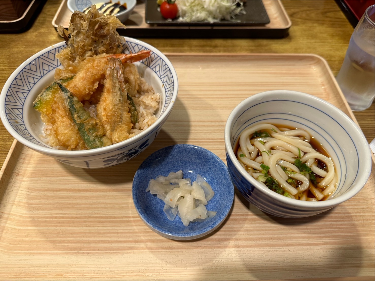 上海老、白身魚、舞茸、かぼちゃ、おくら、れんこんの天丼と、小うどんのセットです。