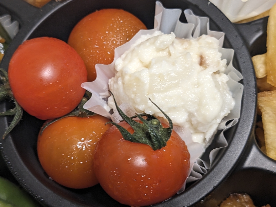 中央は4個のプチトマトとポテトサラダです。ポテトサラダは優しい味で美味しかったです。