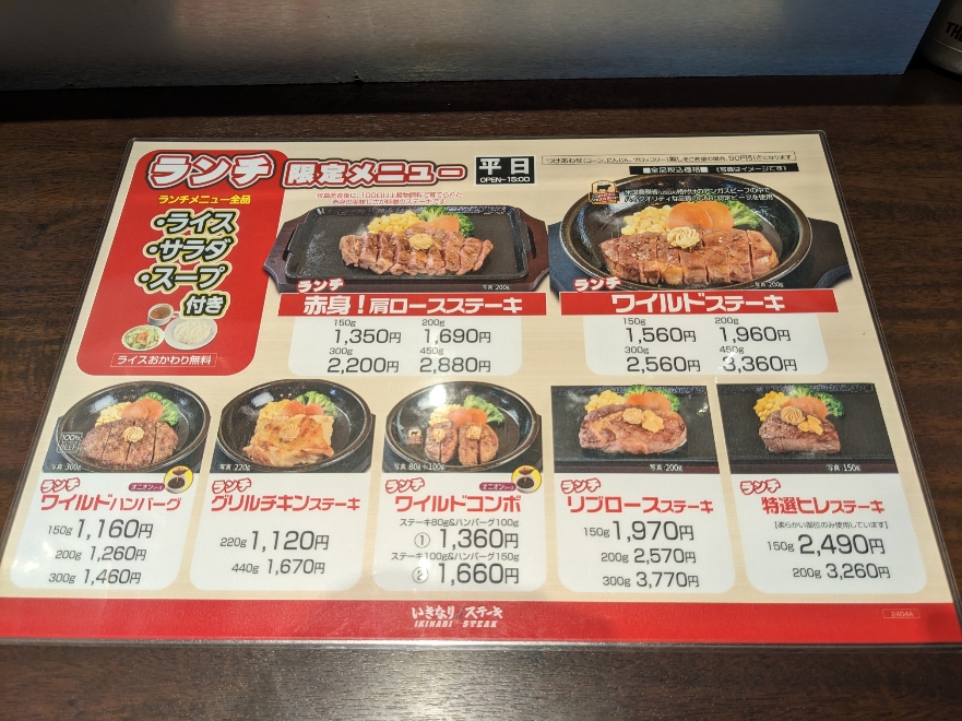 ランチ限定メニュー ●赤身!肩ロースステーキ150g 1,350円 ●ワイルドステーキ150g 1,560円 ●ワイルドハンバーグ150g 1,160円 ●グリルチキンステーキ220g 1,120円 ●ワイルドコンボ ステーキ80g&ハンバーグ100g 1,360円 ●リブロースステーキ150g 1,970円 ●特選ヒレステーキ150g 2,490円