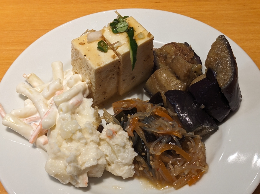 サラダの盛り付け例です。豆腐、ナス、中華風春雨、ポテトサラダ、マカロニサラダ、どれも美味しかったです。