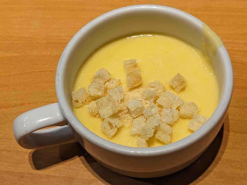 スープも付いてきます。この日はポタージュスープでした。ドロリとかなり濃厚なスープです。クルトンを浮かべています。