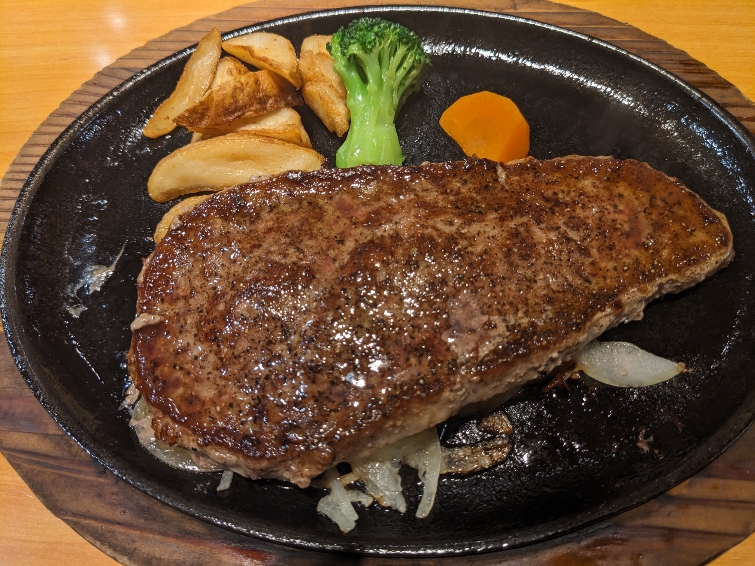 こちらは「学生ハンバーグ」です。定番の「あさくまハンバーグ」とは少し粗挽き風なのか、肉の食感が違います。個人的にはこちらの方が好き。大きさも比べるとかなり大きく見えますし、「学生」だけにボリュームがあるのかと思えますが、量は同じ180gですので、薄く延ばしてある感じです。
