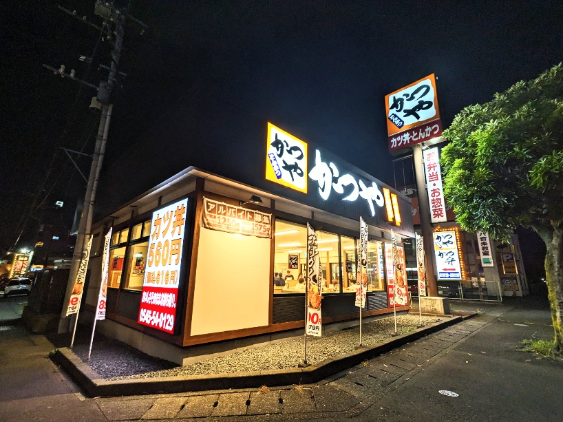 かつやはリーズナブルな値段でとんかつが楽しめるので、いつもお客さんで混んでいます。豚汁も美味しいし、キャベツにつけるドレッシングがゴマ風味で甘味があって美味しいです。 富士見大通りの「中村町南」交差点角にあります。