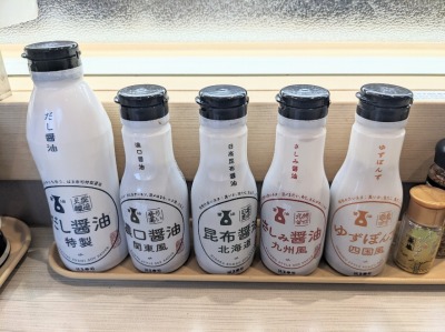 テーブル上にある醤油です。色々な種類の醤油が用意されています。 ・だし醤油 ・濃口醤油 関東風 ・昆布醤油 北海道 ・さしみ醤油 九州風 ・ゆずぽんず 四国風 この他に、減塩醤油も店員さんに頼むと用意があるそうです。