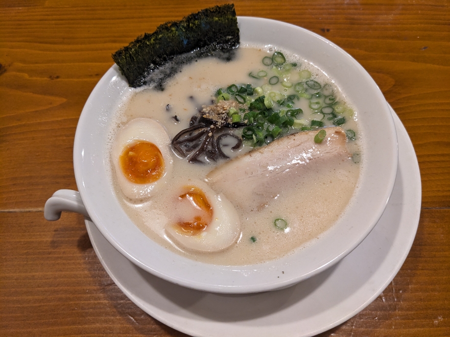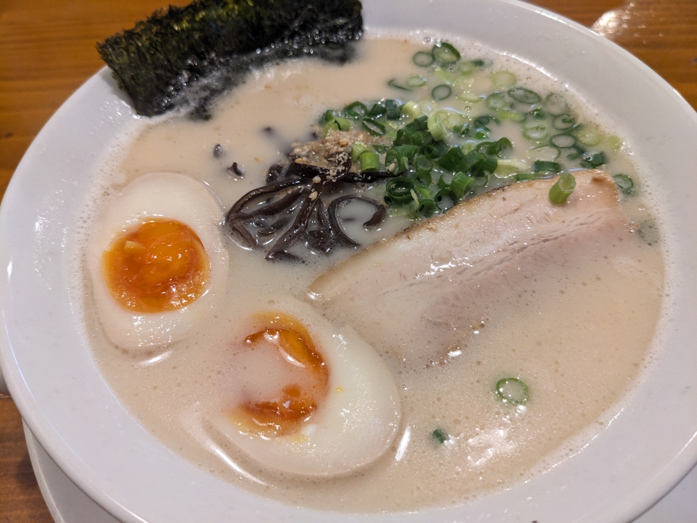 この辺りでは少ない本格的なとんこつラーメンです。半熟玉子はトッピングで追加しました。