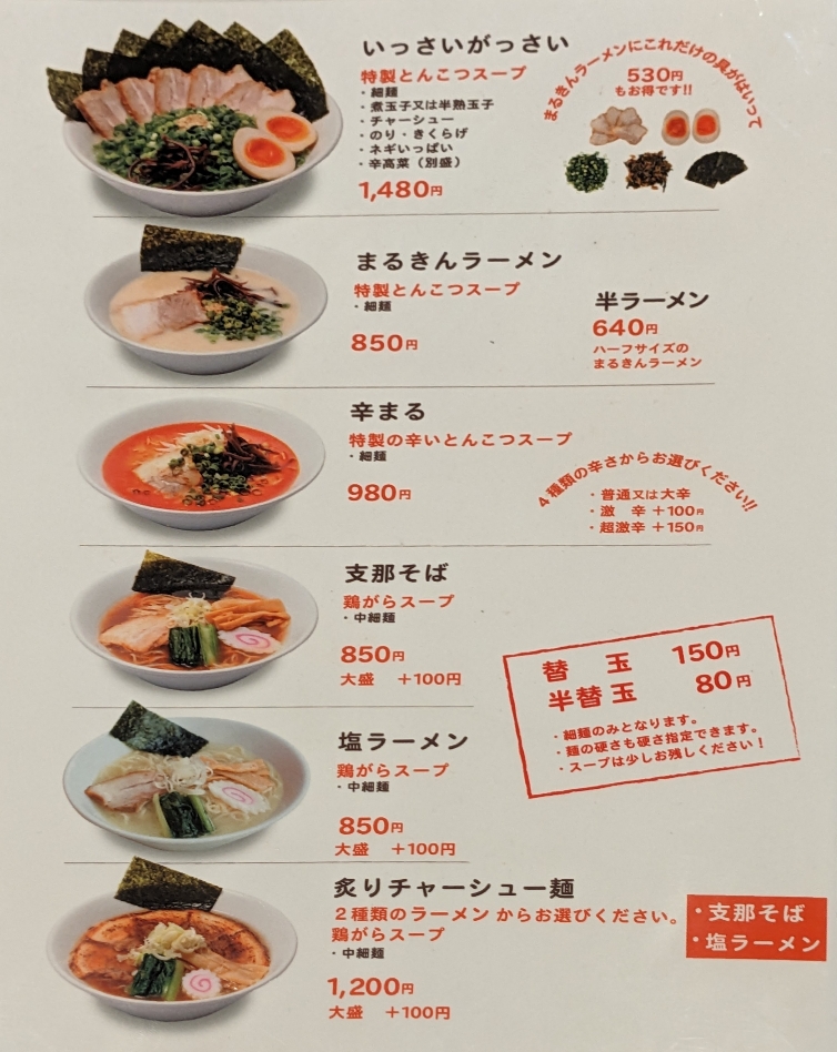 いっさいがっさい 1,480円 まるきんラーメン 850円 辛まる 980円 支那そば 850円 塩ラーメン 850円 炙りチャーシュー麺 1,200円